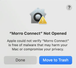 - You can start Morro Connect by opening the app from the Applications folder or searching for the app in Spotlight. When open App, you may see below. To use Morro Connect, you need to trust Morro, and simply click "Open" button to start.