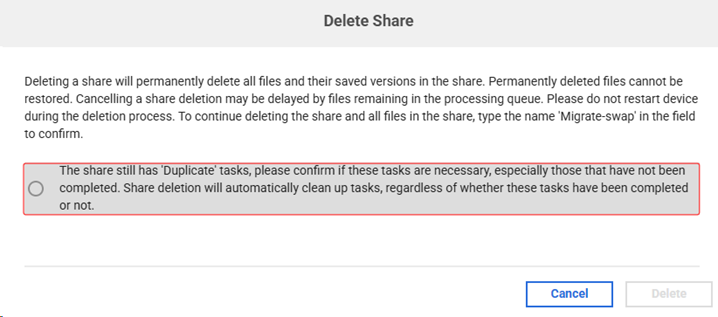 If you want to delete a share that has the Duplicate job, a prompt will appear like the one below. By checking the prompt and entering the share name, the customer can delete both the share and the duplicate job.