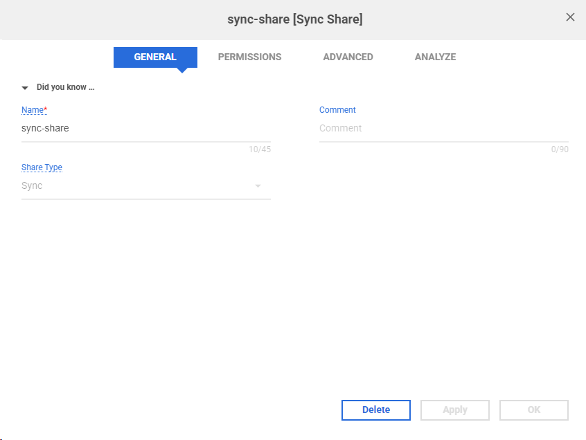 Clicking on a share will bring you to the General tab of the Manage Share page. For example, if we click on dltest0 above, we see the following: